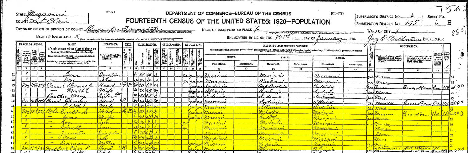 | Street, avenue, road, etc. | House number or farm, etc. | No. of house in order of visitation | No. of family in order of visitation | Name of each person whose place of abode on January 1, 1920 was in this family. Enter surname first, then given and middle initial if any. Omit Children born since January 1, 1920. | Relationship of each person to the head of this family - whether wife, son, daughter, servant, boarder, or other. | Home owned or rented. | If owned, free or mortgaged. | Sex. | Color or race. | Age at last birthday. | Whether single, married, widowed, or divorced. | Year of immigration to the U.S. | Whether naturalized or alien. | If naturalized, give the year. | Attended school any time since September 1, 1919. | Whether able to read. | Whether able to write. | Place of birth - this person. | Mother tongue - this person. | Place of birth - Father of this person. | Mother tongue - Father of this person. | Place of birth - Mother of this person. | Mother tongue - Mother of this person. | Whether able to speak English. | Trade, profession, or particular kind of work done, as spinner, salesman, laborer, etc. | Industry, business, or establishment in wihich at work, as cotton mill, dry goods store, farm, etc. | Employer, salary or wage worker, or working on own account. | Number of farm schedule. |