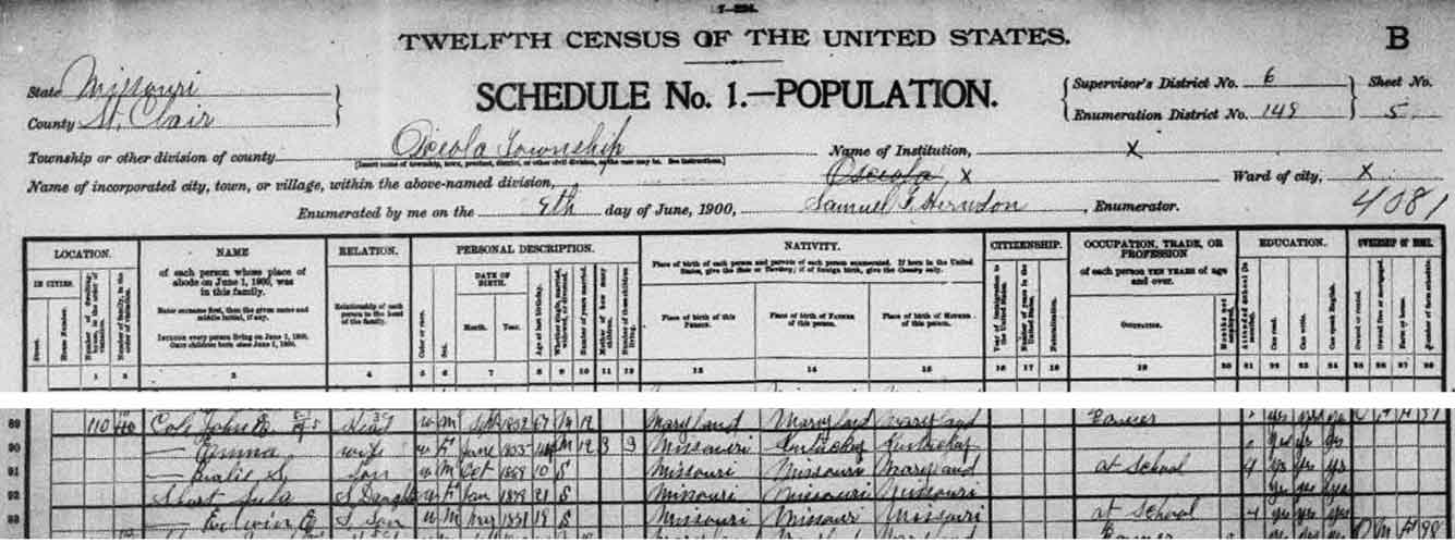 | Street. | House number. | No. of dwelling house in order of visitation | No. of family in order of visitation | The name of every person whose place of abode on the first day of June, 1900 was in this family. Enter surname first, then given and middle initial if any. Include every person living on June 1, 1900. Omit children born since June 1, 1900. | Relationship of each person to the head of this family - whether wife, son, daughter, servant, boarder, or other. | Color or race. | Sex. | Date of Birth / Month. | Date of Birth / Year. | Age at last birthday. | Whether single, married, widowed, or divorced. | Number of years married. | Mother of how many children. | Number of children living. | Place of birth of this person. | Place of birth of Father of this person. | Place of birth of Mother of this person. | Year of immigration to the U.S. | Number of years in the U.S. | Whether naturalized or alien. | Occupation | Months not employed. | Attended school (in months). | Can read. | Can write. | Can speak Englisth. | Owned or rented. | Owned free or mortgaged. | Fram or house. | Number of farm schedule. |