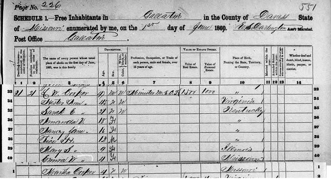 | Dwelling-houses, numbered in order of visitation. | Families, numbered in order of visitation | The name of every person whose usual place of abode on first day of June, 1860 was in this family. | Age. | Sex | Color - White, black, or mulatto. | Profession, Occupation, or Trade of each person, male and female, over 15 years of age. | Value of Real Estate | Value of Personal Estate. | Place of birth, naming the State, Territory, or Country. | Married within the year. | Attended school within the year. | Persons over 20 yrs who cannot read & write. | Whether deaf and dumb, blind, insane, idiotic, pauper, or convict. |