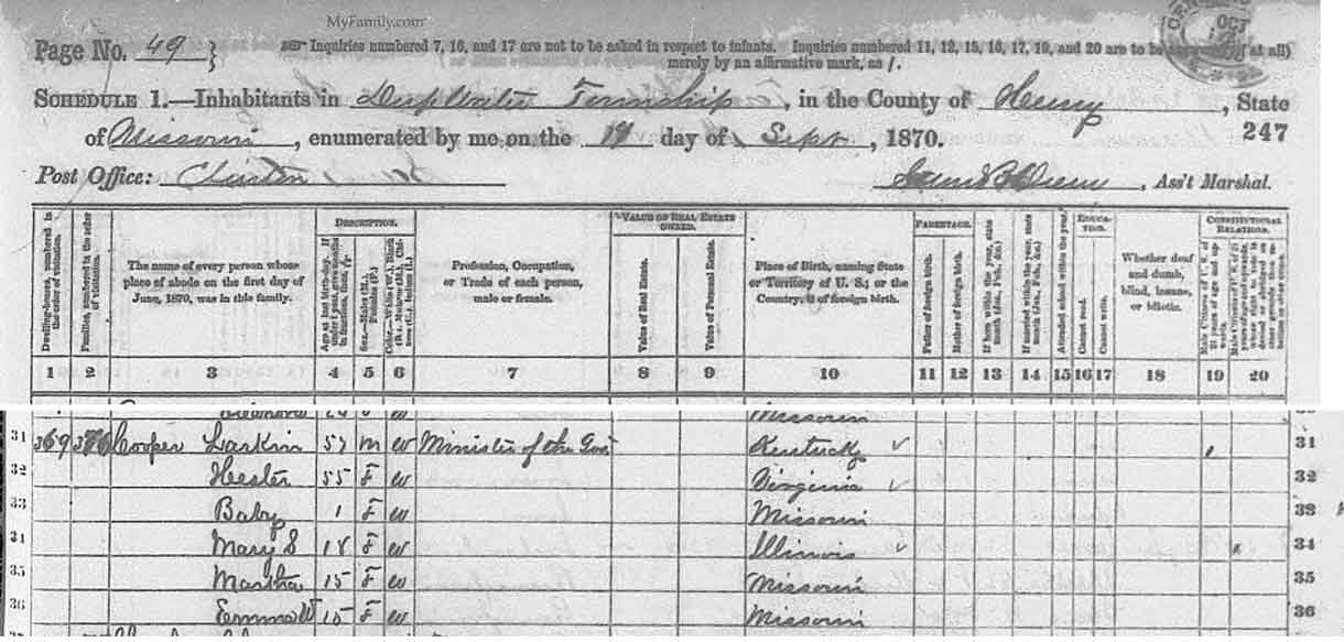 | Dwelling-houses, numbered in order of visitation. | Families, numbered in order of visitation | The name of every person whose place of abode on first day of June, 1870 was in this family. | Age at last birthday prior to June 1, 1880. If under 1 yerar, give months in fractions, thus 2/12 | Sex - Male, Female | Color - White, Black, Mulatto, Chinese, Indian | Profession, Occupation, or Trade of each person, male or female. | Value of Real Estate | Value of Personal Estate. | Place of birth, naming State or Territory of the U.S, or the Country if of foreigh birth. | Father of foreign birth. | Mother of foreign birth. | If born within the year, state the month (Jan., Feb., etc.) | If married within the year, state the month (Jan., Feb., etc.) | Attended school within the year. | Cannot read. | Cannot write. | Whether deaf and dumb, blind, insane, or idiotic. | Male Citizens of the U.S. of 21 years of age and upwards. | Male Citizens of the U.S. of 21 years of age and upwards, where right to vote is denied or abridged on other grounds than rebellion or other crime. |