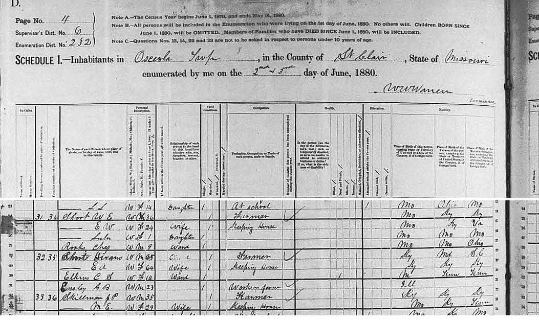 | Page | Enumeration Date | Name of Street. | House Number. | Dwelling homes numbered in order of visitation. | Families numbered in order of visitation | The name of every person whose place of abode on first day of June, 1880 was in this family. | Color - White, Black, Mulatto, Chinese, Indian | Sex - Male, Female | Age at last birthday prior to June 1, 1880. If under 1 yerar, give months in fractions, thus 2/12 | If born within the census year, give the month. | Relationship of each person to the head of this family - whether wife, son, daughter, servant, boarder, or other. | Single. | Married. | Widowed or Divorced | Married during census year. | Profession, Occupation, or Trade of each person, male or female. | Number of months this person has been unemployed during the Census year. | Is the person (on the day of the Enumerator's visit) sick or temporarily disabled, so as to be unable to attend to ordinary business or duties? If so, what is the sickness or disability? | Blind. | Deaf and Dumb. | Idiotic. | Insane. | Maimed, Crippled, Bedridden or otherwise disabled. | Attended school within the census year. | Cannot read. | Cannot write. | Place of birth of this person, naming State or Territoryof the United States, or the Country if of foreigh birth. | Place of birth of the FATHER of this person, naming State or Territoryof the United States, or the Country if of foreigh birth. | Place of birth of the MOTHER of this person, naming State or Territoryof the United States, or the Country if of foreigh birth. |